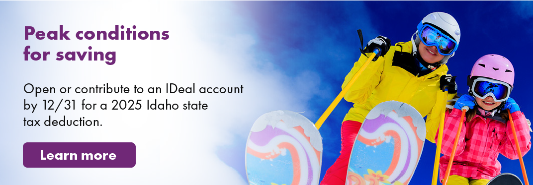 For more information about IDeal - Idaho College Savings Program ("IDeal"), call 866-433-2533 click here to obtain a Disclosure Statement. The Disclosure Statement discusses investment objectives, risks, charges, expenses, and other important information. Because investing in IDeal is an important decision for you and your family, you should read and consider the Disclosure Statement carefully before investing.